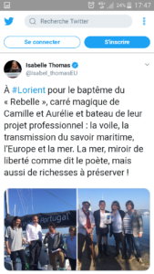 Ce samedi 30 mars 2019 nous avons été reçus au port de Kernével à Lorient par Camille Carrée skipper formateur et Aurélie sa compagne pour le baptême du voilier Le Rebelle – Voile In Portugal. Une journée bien orchestrée en présence des parrains Benoît Hamon et Emmanuelle Trocadero ainsi qu’Isabelle Thomas députée Européenne.
